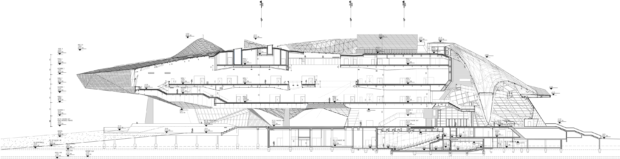 - el Zócalo de hormigón: un sótano de hormigón armado en dos niveles semienterrados que soporta las partes superiores del museo. Alberga las áreas técnicas, los talleres, dos auditorios con capacidad para 344 y 122 personas respectivamente y la recepción para grupos.