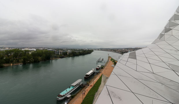 Una estructura nebulosa hecha de vidrio, hormigón y acero se asienta en la punta de una península, en la confluencia de los ríos Ródano y Saona.