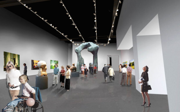 La galería de planta baja está diseñada como un gran espacio industrial, con pisos de cemento y sin cielorraso, con la estructura a la vista. Este espacio proporciona al público una visual a través de una gran ventana, sobre el muro exterior que funciona como conector en el espacio público. A su vez, esta ventana ofrece una relación directa de los transeúntes con el interior del museo, como parte de la vida cotidiana de la ciudad.