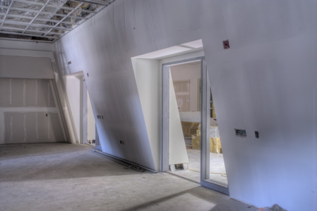 Las formas de la adición están revestidas con luminosos paneles de acero azules, terminando en una única superficie transversal de la eclosión que ayuda a difundir y suavizar el reflejo de la luz del acero inoxidable. Los paneles cambian de color dependiendo de la hora del día, el tiempo, y la posición del espectador, creando una superficie dinámica, viviente.