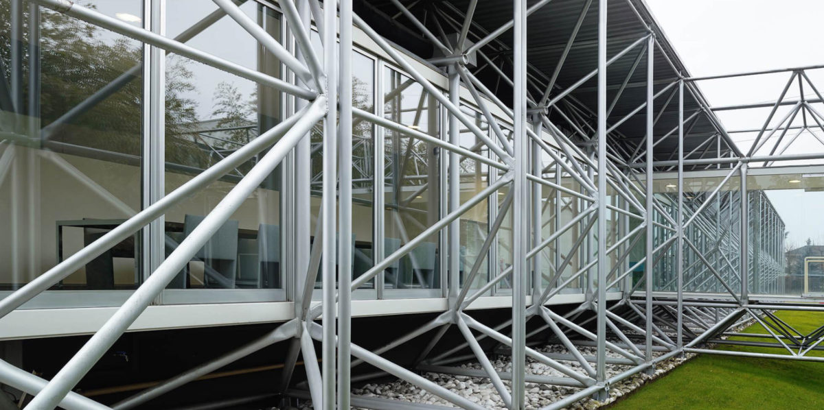 La estructura modular del edificio, formada por una serie de 20 pórticos de acero, ligeros y suspendidos, colocados paralelamente, con 40m de luz cada uno crean un espacio útil y flexible entre ellos, libre de columnas, que puede ser ampliado simplemente añadiendo portales a la estructura y paneles prefabricados para los muros cortina. Los muros son grandes ventanales por un lado y por los otros las placas opacas de los pórticos, en lugar de estructuras portantes. A la vista los tubos de colores que se mimetizan armónicamente con el entorno natural del edificio. El efecto de suspensión también se ve reforzado por la rampa saliente en la entrada a la oficina y la fábrica.