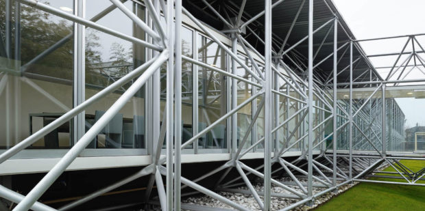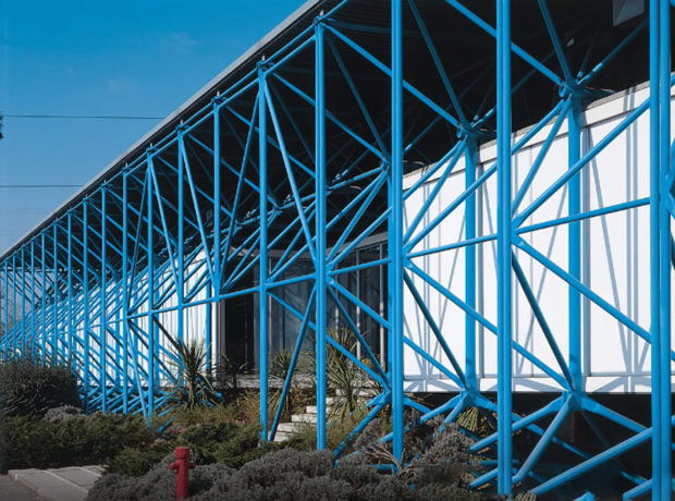 La estructura modular del edificio, formada por una serie de 20 pórticos de acero, ligeros y suspendidos, colocados paralelamente, con 40m de luz cada uno crean un espacio útil y flexible entre ellos, libre de columnas, que puede ser ampliado simplemente añadiendo portales a la estructura y paneles prefabricados para los muros cortina. Los muros son grandes ventanales por un lado y por los otros las placas opacas de los pórticos, en lugar de estructuras portantes. A la vista los tubos de colores que se mimetizan armónicamente con el entorno natural del edificio. El efecto de suspensión también se ve reforzado por la rampa saliente en la entrada a la oficina y la fábrica.