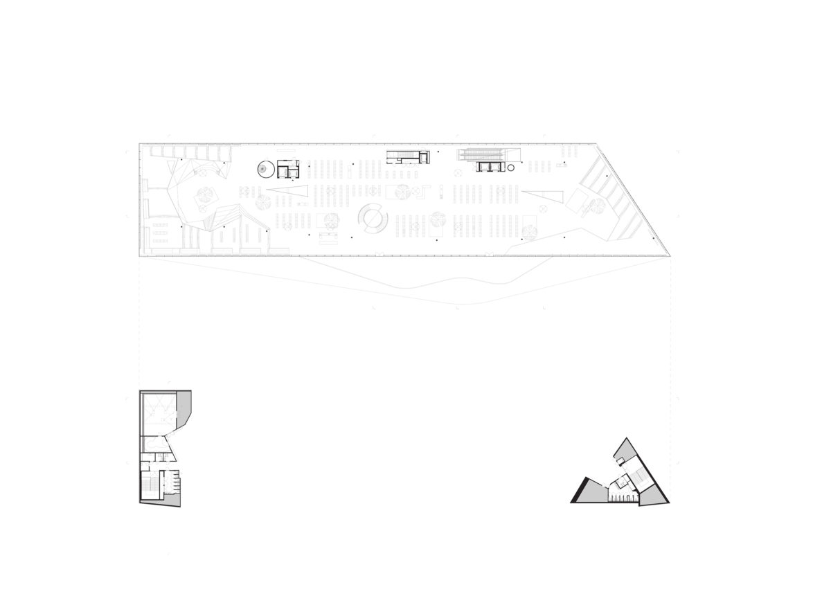 «…El diseño crece a partir de la dinámica entre el sitio y los objetivos del programa de la biblioteca. El concepto clave es la interacción entre los tres pisos individuales del edificio. La plaza pública en frente del edificio continúa dentro del edificio, fusionándose con un catálogo de características de reunión y experiencia. La planta baja es un espacio robusto, ocupado y libremente actualizado, adecuado para visitas rápidas y recorridos. Los espacios públicos activos de umbral cero son visibles, atractivos, comprensibles y acogedores para todos los visitantes.
