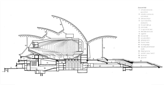 Tras obtener el triunfo en un concurso internacional, en 1959 iniciaba el arquitecto danés Jørn Utzon la construcción de su controvertido edificio de la Opera House de Sydney, en Bennelong Point, en la idea que el mismo arquitecto definía como «de gajos de naranja». Los extraordinarios complejos problemas de ingeniería a los que tuvo que hacer frente Utzon provocaron el retraso en la realización del proyecto, que el ingeniero había anunciado finalizar en tres años y con un coste de tres millones de dólares australianos, cuando el edificio se concluyó quince años después de su inicio, con un coste total de 102 millones de dólares. Utzon había renunciado al proyecto ya que la calidad del sonido interior del edificio no correspondía a su espectacularidad exterior.
