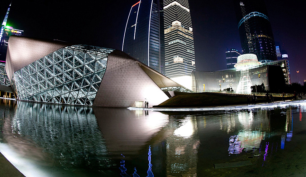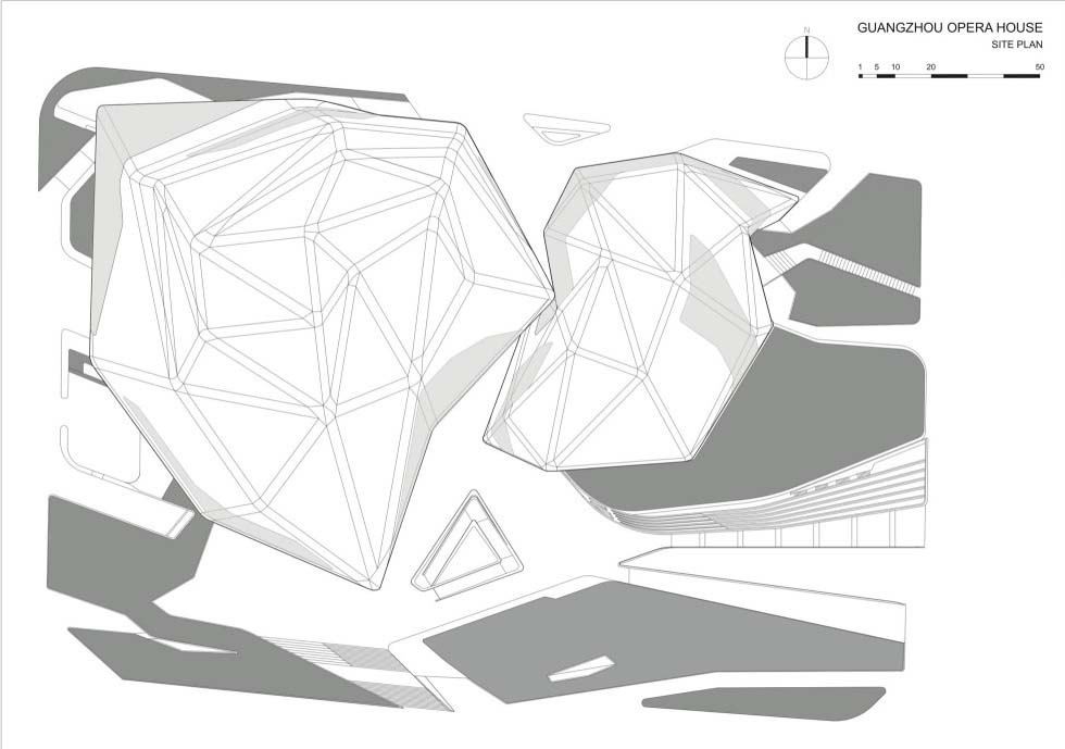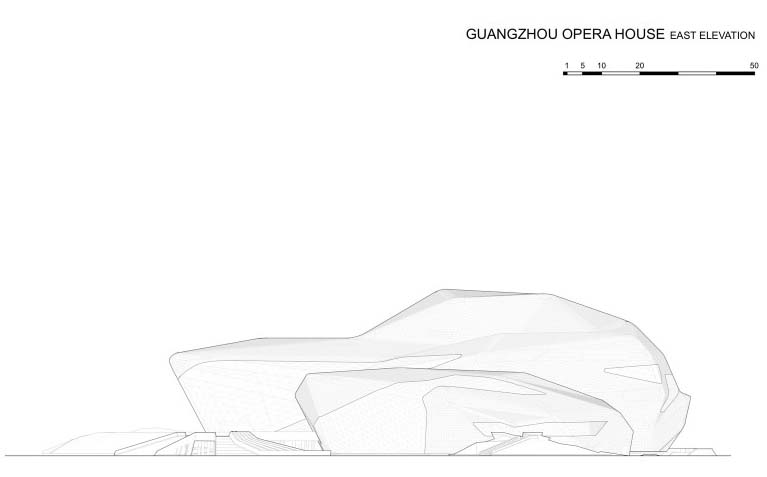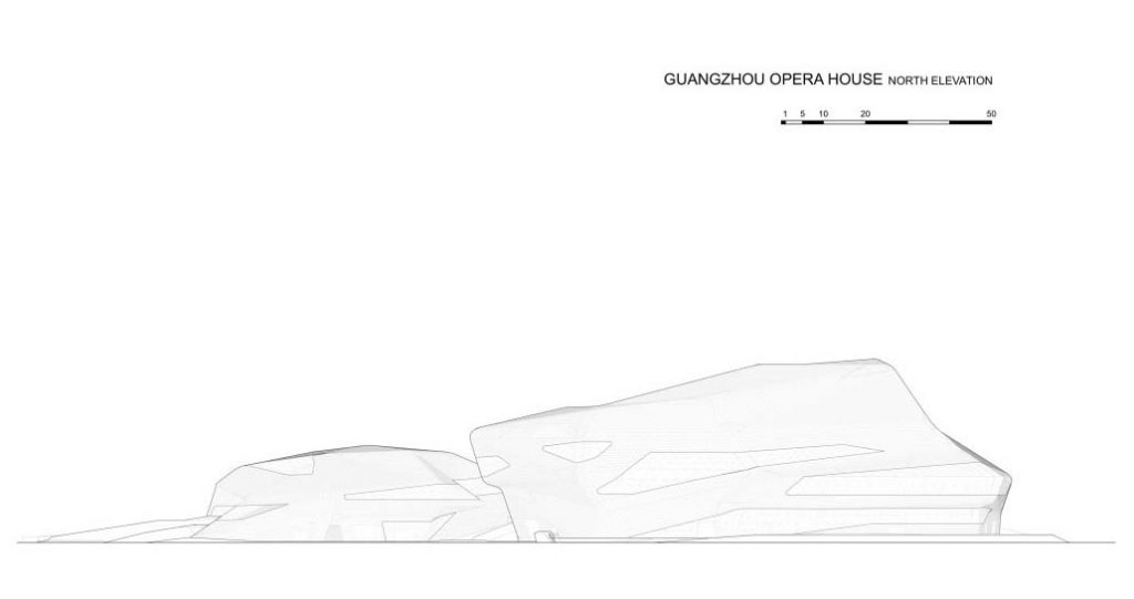 La arquitecta Zaha Hadid dio la forma a esta estructura de tal manera que se asemejara a dos piedras en la orilla del Pearl River. El diseño de la Ópera es una singular exploración de relaciones urbanas contextuales de Zaha Hadid Arquitectos, que combina las tradiciones culturales que han dado forma a la historia de Guangzhou, con la ambición y optimismo que creará su futuro.