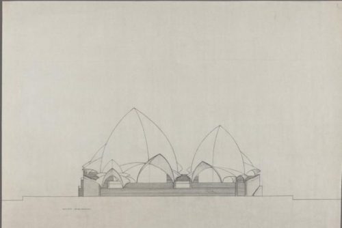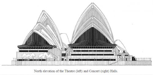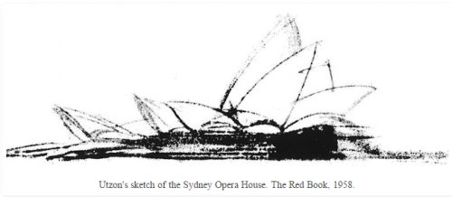 “…muchas personas dicen que mi diseño fue inspirado por los yates de vela del puerto o por conchas marinas. Este no es el caso. Es como una naranja, si pelas una naranja obtienes estos segmentos, formas similares a estas. Fue así en mis modelos. Yo no pensé que deberían ser como velas en el puerto. Dio la casualidad de que fueran similares. Fui influenciado por las velas en la medida en que mi padre era un arquitecto naval y yo estaba familiarizado con formas grandes (barcos). Yo nunca había visto Sydney Harbor cuando hice este diseño, aunque me sentí muy familiarizado con el lugar por fotografías y cartas navales…»