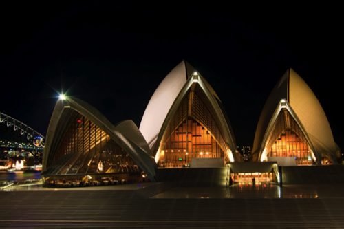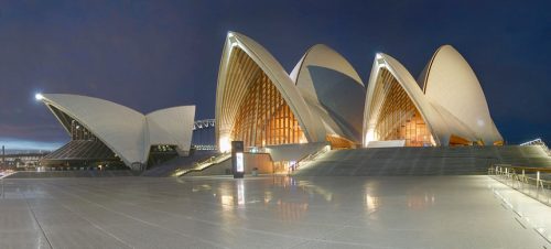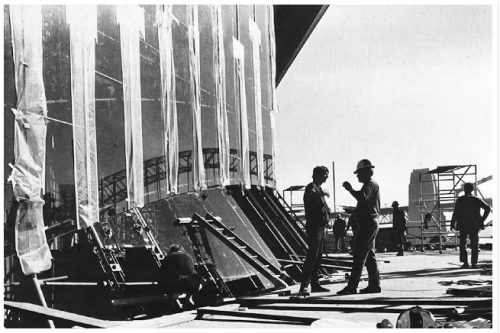 Tras obtener el triunfo en un concurso internacional, en 1959 iniciaba el arquitecto danés Jørn Utzon la construcción de su controvertido edificio de la Opera House de Sydney, en Bennelong Point, en la idea que el mismo arquitecto definía como «de gajos de naranja». Los extraordinarios complejos problemas de ingeniería a los que tuvo que hacer frente Utzon provocaron el retraso en la realización del proyecto, que el ingeniero había anunciado finalizar en tres años y con un coste de tres millones de dólares australianos, cuando el edificio se concluyó quince años después de su inicio, con un coste total de 102 millones de dólares. Utzon había renunciado al proyecto ya que la calidad del sonido interior del edificio no correspondía a su espectacularidad exterior.