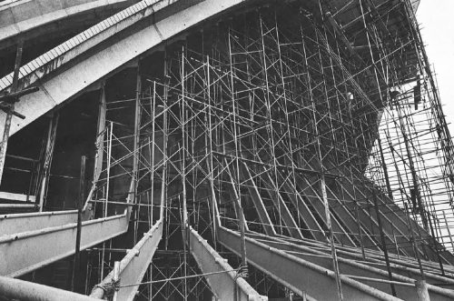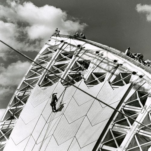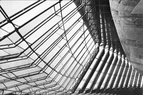 El logro de esta solución evitó la necesidad de la construcción del costoso encofrado permitiendo el uso de las unidades prefabricadas. Ingenieros de Ove Arup & socios comprobaron in situ la construcción y colocación de las piezas de la bóveda, en la cuál se utilizó un innovador sistema de sujeción de acero denominado arco de construcción para apoyar las diversas azoteas antes de la terminación. Así para la forma de la estructura de las vigas se uso un sistema de abanico. Las vigas partían de un punto abriéndose como un abanico siendo su trazado el de los meridianos de la esfera haciendo que la línea que las define tendría para todas las vigas el mismo radio: 460 pies.