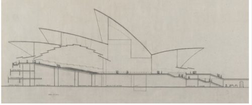 Cada elemento del diseño, desde cómo estaba situado el edificio, los múltiples puntos de vista, la amplia escalera de 100 metros de ancho, tenían la intención de hacer que los visitantes se sientieran bienvenidos y relajados. Los boceto de Utzon muestran cómo el podio fue pensado para encajar dentro de la estructura general.