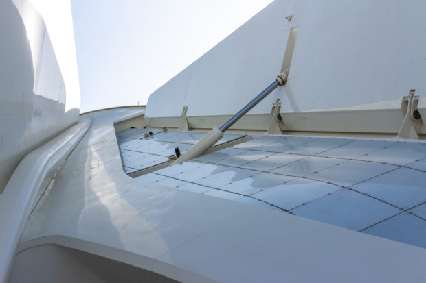 Estas aletas retráctiles de fibra de carbono, que representan las alas del halcón, se pueden mover hidráulicamente y permiten una mayor penetración de la luz del día, pero con control de ganancia solar. Las células fotovoltaicas, fabricadas en los Emiratos, están integradas en el diseño de las alas que sobrevuelan las fachadas externas por lo que no sólo dan sombra a las paredes verticales sino también a las rutas de circulación pública a su alrededor. Cada una de las alas gira alrededor de un solo punto y todo el techo se puede abrir en tres minutos. Mediante 46 mecanismos hidráulicos que actúan como pistones las alas pueden cubrir un rango de 110 y 125 grados. Una vez activado, el aceite hidráulico se empuja a través de estos actuadores, extendiendo los pistones para abrir las alas a su máxima capacidad. Cuando las alas están cerradas también protegen las placas de la lluvia y las tormentas de arena.