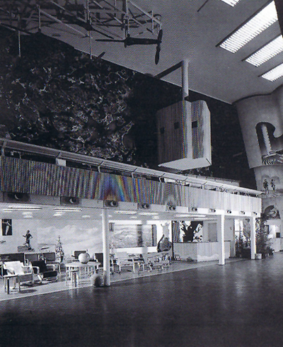 La ondulante fachada fue iluminada con focos que proyectaban luces de colores, creando a través de estos mecanismos visuales una compleja tensión espacial en el interior del recinto que lo convertían en una especie de instalación artística.