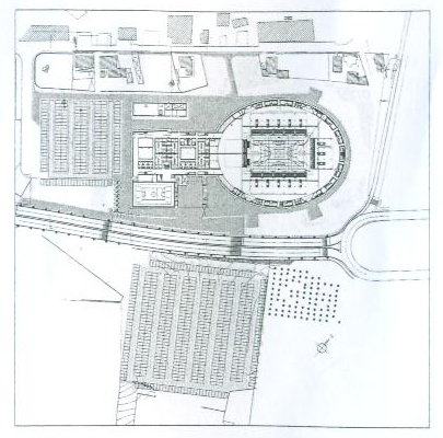 El volumen elíptico, con ejes de 104,4 y 84 metros y una altura que varía desde los 15,5 metros en la fachada hasta los 21,4 en la parte más elevada, está constituido fundamentalmente por un muro doble de hormigón armado cubierto por la estructura de una malla espacial de barras de acero.