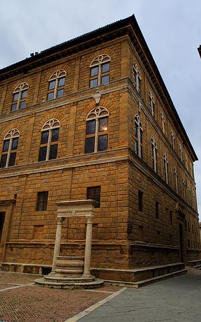 El Palazzo Piccolomini fue diseñado por Alberti, que era funcionario papal y consejero de Pío II, aunque éste designó a Bernardo Rossellino como maestro de obras ya que él no podía permanecer en la ciudad y fue el segundo quien llevó adelante el proyecto, siendo el único edificio de estilo renacentista florentino del casco antiguo de Siena.