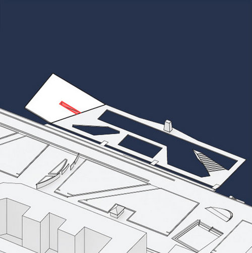 La superficie inclinada del techo está escalonada para permitir que los visitantes se puedan sentar o acostar a tomar sol. Desde los asientos se tiene una visión general de las diferentes piscinas. La zona también se puede utilizar como anfiteatro para diferente tipos de espectáculos.