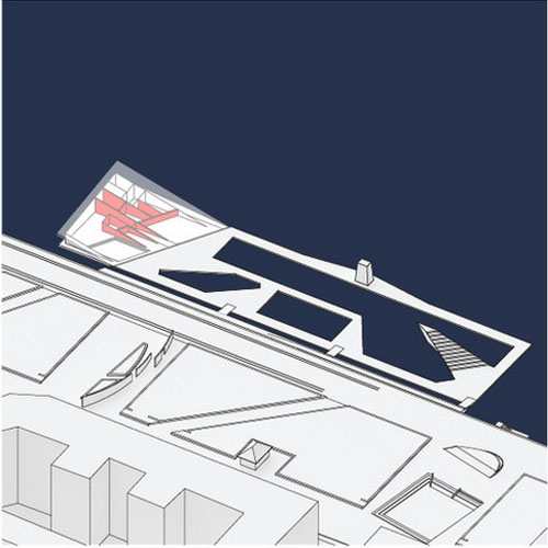 Las terrazas de deck de las piscinas del puerto se extienden y levantan para integrar las adyacentes construcciones que albergan las saunas y los baños termales que dan vida al barrio durante el invierno. A su vez las formas elevadas del techo en las nuevas instalaciones permiten la colocación de una pared de cristal en la fachada exterior y una zona escalonada para el reposo, que ofrecen vistas de las actividades exteriores del puerto. Durante los oscuros meses de invierno los baños termales dan vida a la zona y se pueden ver como una “linterna” en el barrio.