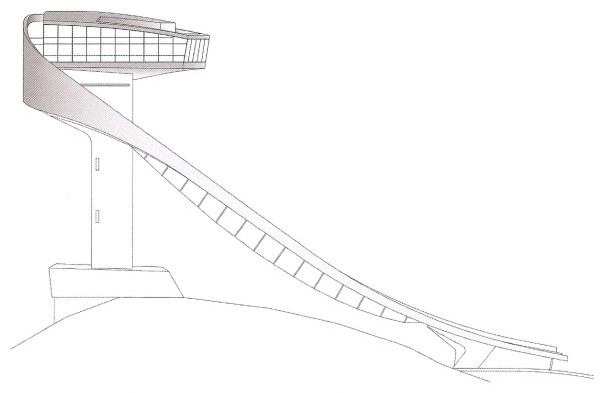 La rampa, barrida de nieve, está expuesta a la más ligera de las cargas, el peso del propio competidor, y su forma catenaria recuerda a una tira colgante, suspendida entre componentes estructurales sólidos con el fin de conformar una banda muy fina que apenas contrasta con el cielo.