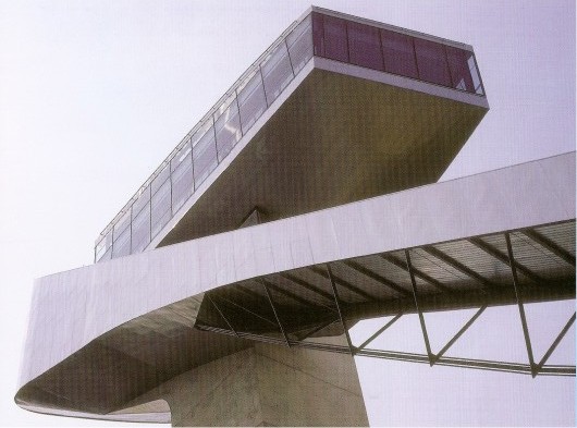 Los márgenes del final de la rampa son unos enormes contrafuertes o estribos de hormigón armado, y existe una disonancia entre la torre principal y el estribo de menores dimensiones. Los ángulos del bloque que forma la base sobresalen hacia fuera para formar el borde de la pista, y de forma simultánea, oponen resistencia a las cargas laterales del añadido de la rampa; una forma estructural perfecta. La terminación superior se extiende formando una especie de envoltorio, fundiéndose con el espacio destinado al público, en voladizo junto al eje de la torre.