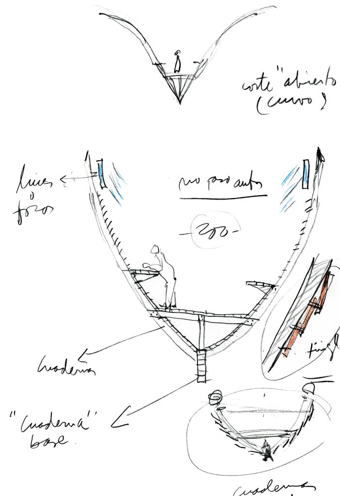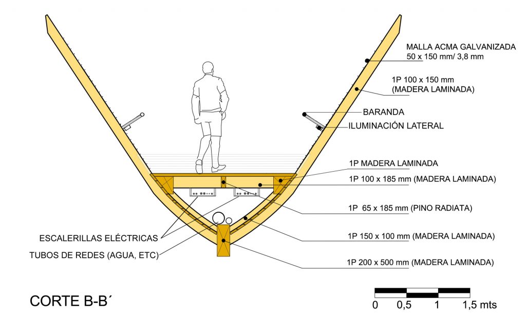 Las deformaciones son controladas por el total formado por esta viga madre y dos vigas secundarias paralelas, ubicadas a los costados. Las tres vigas se unen por las “cuadernas” y por el entablado. Los elementos interiores están comprimidos o traccionados.