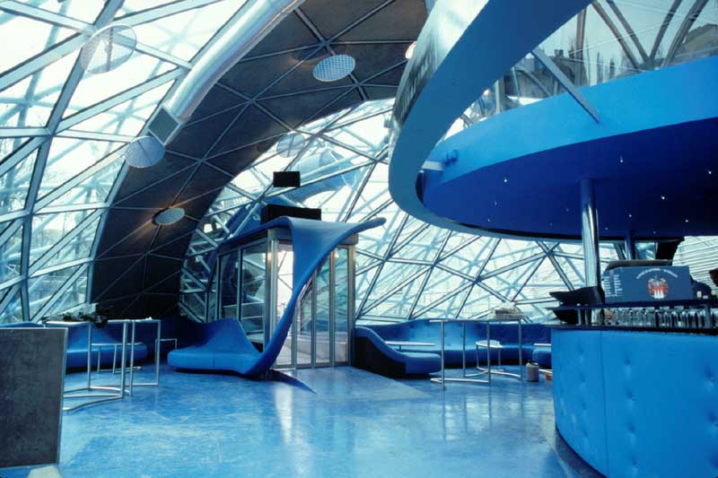 En su parte cerrada y bajo el techo de cristal abovedado de la cúpula hay un café azul y blanco, donde la gente puede disfrutar de la terraza en la parte de arriba o del restaurant -cafetería de abajo. Asientos triangulares flexibles y curvos se pueden mover dentro del espacio para permitir diferentes configuraciones.