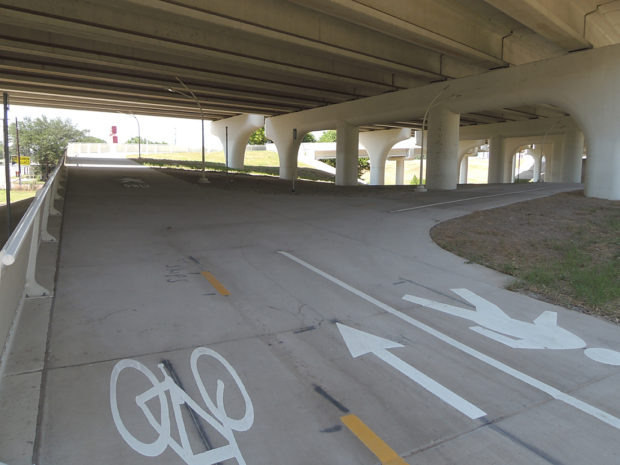 La IH-30, construida por el Departamento de Transporte de Texas, tiene 10 carriles principales para tráfico rodado con un carril reversible para vehículos de alta ocupación y 4 carriles laterales. Los puentes peatonales y para bicicletas Margaret McDermott en los laterales de la Interestatal son dos puentes gemelos paralelos consistentes en dos arcos de empuje que abarcan 343m desde la base donde comienza el arco hasta la base donde termina y se elevan 87m sobre la cubierta del puente. Los puentes de 6,10m de ancho cuentan con una acera elevada de 2,13m para peatones y dos carriles para bicicletas de 3,35m. El punto más alto de los arcos es de 107m sobre el río. Cada uno de ellos está clavado en el lado exterior del puente de la autopista, uno en dirección este, el otro en el lado exterior oeste.