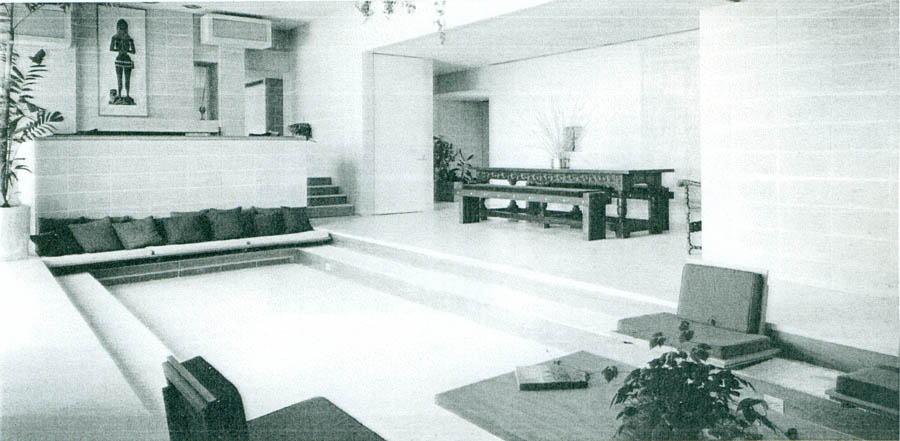 La planta está diseñada en torno a una amplia sala de estar de doble altura, la cual está dos escalones por debajo de un comedor abierto por un lado y un estudio por el otro. Dichos escalones se traducen en asientos funcionales. El desplazamiento de la plataforma del suelo y los cambios de nivel se ajustan a las características específicas del espacio.
