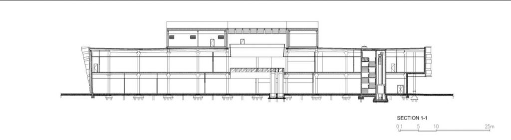 La activa imagen de la fachada expresa la activa naturaleza del lugar. Su dinámica está reforzada mediante el uso de agrupaciones metálicas de colores diferentes. La forma de la cubierta tiene como función específica el ser percibida fácilmente desde puntos de vistas distantes.