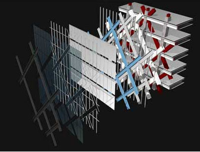 La estructura de la sede de CCTV, y las fuerzas que actúan dentro del edificio, son visibles en su fachada: una red de diagonales que se hace densa en áreas de mayor estrés, más flexible y más abierta en áreas que requieren menos apoyo. La fachada en sí se convierte en una manifestación visual de la estructura del edificio.