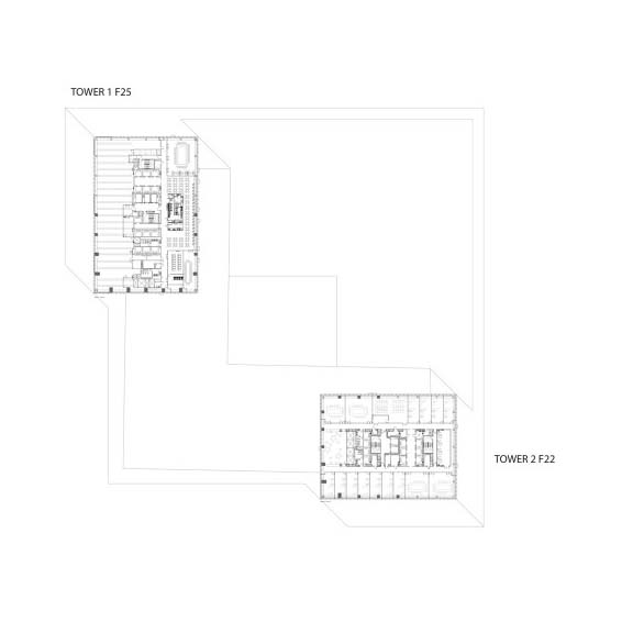 Las torres fueron construidas en las esquinas diagonales opuestas con una huella de 160 x 160 mts, sobre una base de 45m de altura y 9 plantas, unidas por un podio en forma de ‘L’. En su parte alta fueron co-unidas por un puente en ‘L’ paralelo al podio. Centros delgados de concreto dentro del edificio apoyan los pisos internos. Los sótanos, con 4 niveles llegan hasta los 18m bajo rasante.