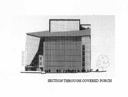 A pesar de que los vestíbulos de entrada, tanto al teatro como al casino, están totalmente acristalados en la fachada oeste, la luz del sol se bloquea debido al dramático techo de aluminio que sobresale en la zona del porche, evitando la entrada directa de luz.