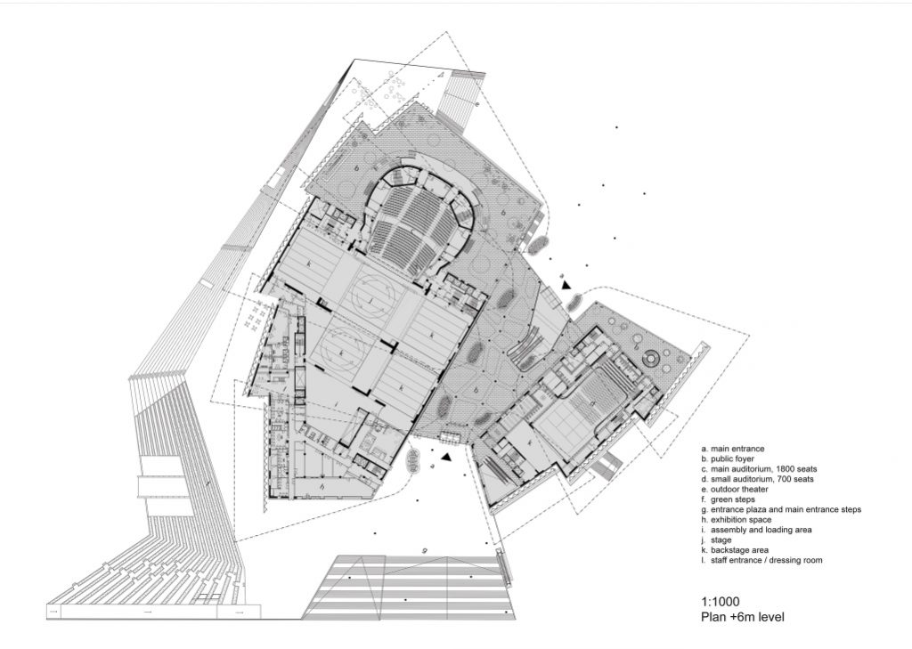Con el fin de sacar el máximo provecho a su ubicación junto al lago, la entrada principal y los espacios públicos se han planteado desde el nivel circundante, creando un zócalo de piedra que se eleva 6 metros del nivel de calle. En la parte superior de éste se ubican los dos auditorios de piedra, unidos por el vestíbulo acristalado de la entrada, con vistas abiertas hacia Wu Li-Lake. Vistas adicionales del lago y la ciudad vieja se obtienen desde los dos foyers laterales y las terrazas que se conectan con ellos.