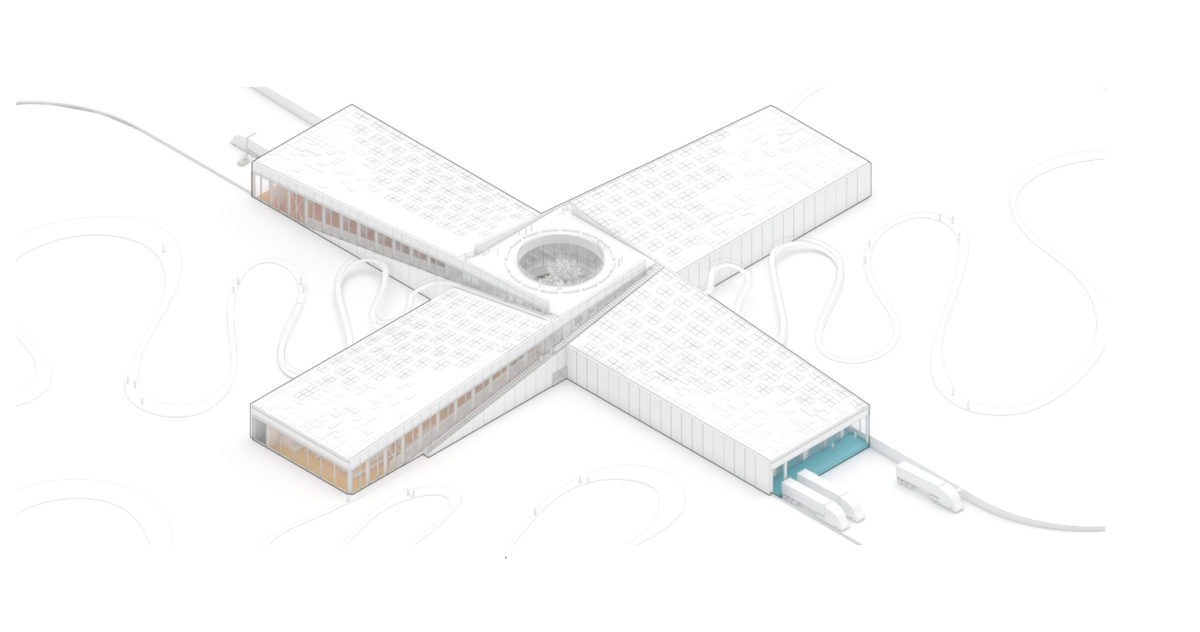 El edificio se concibe como la traducción directa de la logística en arquitectura. Una matriz radial con cuatro salas de producción principales: la fábrica de color, la fábrica de madera, el departamento de ensamblaje y el almacén, que están dispuestas alrededor de un patio central que forma el corazón del edificio y genera la forma “plus” en su intersección. La geometría proporciona un flujo de trabajo abierto y eficiente, al tiempo que permite que las cuatro alas de la fábrica estén en contacto directo con el bosque. En el centro del edificio se encuentra el centro de experiencia, que ofrece vistas de 360 grados de todo el proceso de producción.