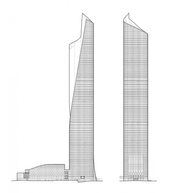 Con el objetivo de maximizar los puntos de vista y minimizar la ganancia de calor solar en las plantas de oficinas, un cuarto de cada placa de piso no está cincelada hacia el lado sur, provocando el desplazamiento de toda la torre de oeste a este. El resultado de esta acción revela una rica piedra monolítica en la pared sur, enmarcada por las abocinadas y elegantes cintas de sinuosas paredes que definen la forma icónica de la torre.