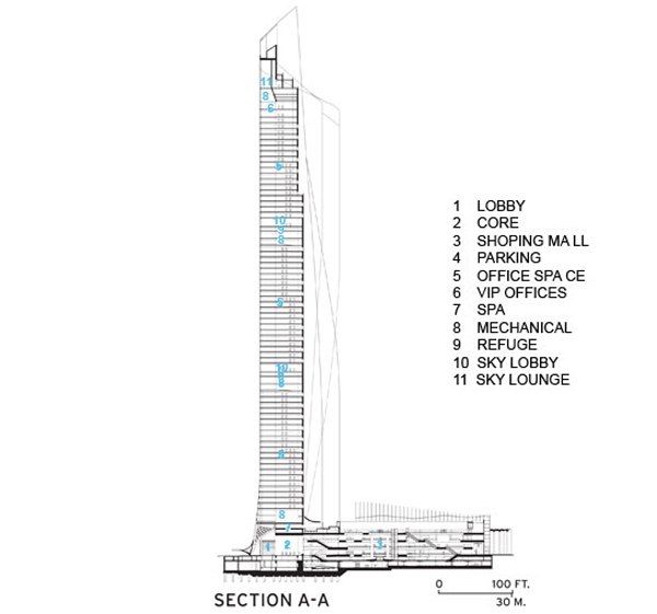 El punto en el vértice de la torre no sólo resuelve esta geometría compleja de las talladas paredes acampanadas, sino que también implica la continuación de la escultural forma hacia arriba. En cada piso de la torre un puente conecta las dos alas. A medida que el concepto de torre tomó forma, se hizo evidente que la forma en espiral concentraría cargas de gravedad en el lado oeste de la huella del edificio, por debajo de la pared sudoeste, mientras que en los extremos norte y sureste éstas serían mínimas. En respuesta a este diferencial de carga, los ingenieros idearon una balsa de hormigón armado de casi cuatro metros de espesor apoyada en 289 pilotes, cada uno entre 20-27 metros de largo, incrustados profundamente alrededor de las áreas de mayor estrés.