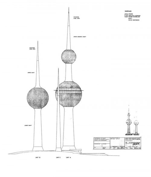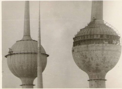 Diseñadas por VBB Swedish Engineers, Sune Lindström y Malene Björn y construidas por RAD, empresa contratista de Belgrado, la Torre de Kuwait (أبراج الكويت), nombre generalmente utilizado en singular aunque haga referencia un grupo de tres torres, fue inaugurada el 1 de Marzo de 1979. Su construcción formaba parte de un proyecto de distribución de aguas, a cargo de una empresa sueca cuyo arquitecto, Sune Lindström, erigió cinco grupos de sus típicas torres de agua “setas”, pero el emir de Kuwait, el jeque Jaber Al-Ahmed, quería un diseño más atractivo para el sexto grupo. Se le presentaron 10 diseños diferentes, decidiéndose por el presentado por el arquitecto danés Malene Björn .