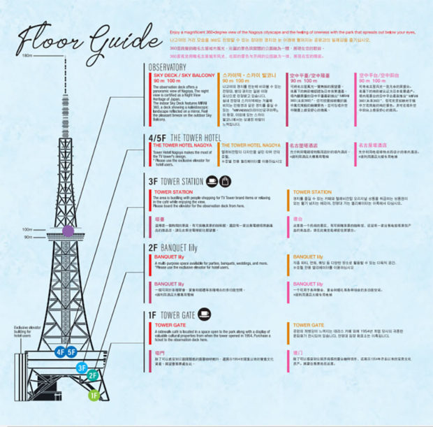 Además de las plataformas de observación, Sky Deck a los 90m del suelo que ofrece vistas panorámicas del valle y las montañas de Nagoya desde un lugar protegido y el Sky Balcony al aire libre a los 100m, con la renovación de la torre se ha instalado un hotel de lujo en el cuarto y quinto piso de su estructura, el Tower Hotel Nagoya.