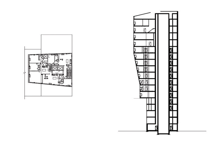 El edificio consta de 32 viviendas en total, 21 unidades de uno y dos dormitorios cerca de la base, 2 unidades de planta completa con amplias terrazas más arriba y un ático dúplex como coronación. La pared creada por la ventana inclinada es una característica de muchas unidades aunque todas tienen ventanas de altura completa en la sala y el comedor.
