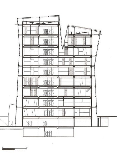 En términos constructivos, la torre central se divide en dos cuerpos: las losas y vigas se interrumpen en su parte central, funcionando en forma individual. Un tema a considerar en la zona de implantación es la estructura antisísmica. Con las actuales herramientas computacionales para el cálculo estructural, fue posible cumplir con los requerimientos antisísmicos apropiados para este proyecto. Los muros y pilares resistentes son absolutamente perpendiculares al suelo, y la falta de verticalidad de la torre es sólo aparente desde el punto de vista estructural. La forma oblicua se consigue mediante la fachada, con una estructura metálica que se apoya en voladizos de hormigón armado a lo largo de las vigas de los marcos rígidos. Al darles diferentes longitudes a estos voladizos, se produce la forma oblicua final de las fachadas.