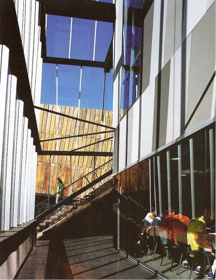 Al ser el destino del edificio para estudio con computadoras, las salas se mantienen en penumbras para evitar el reflejo de la luz sobre las pantallas. Enterrando la placa de la torre se redujo la necesidad de aberturas al mínimo.