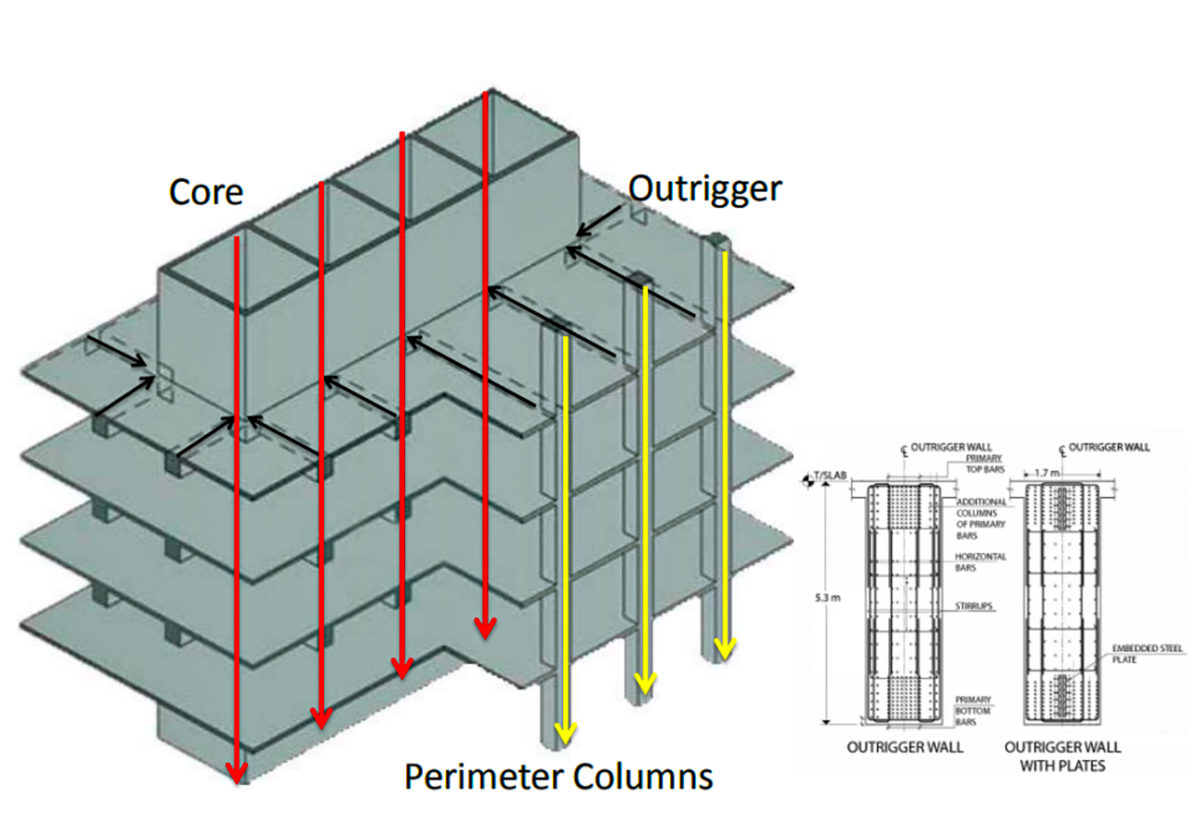Las alas de los muros del núcleo tienen hasta 1,2 mts de espesor, mientras que las paredes de 12,5 metros de largo suelen tener un espesor de 460 mm