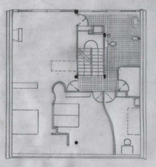 La escalera principal comunica la planta baja con esta planta que tiene las habitaciones así como los baños situándose en el espacio central y de movimiento. Las habitaciones se expanden por toda la planta pareciendo abrazar las escaleras que quedan atrapadas entre la franja central de columnas de donde se desprende un muro curvo que delimita la prima habitación de la segunda.