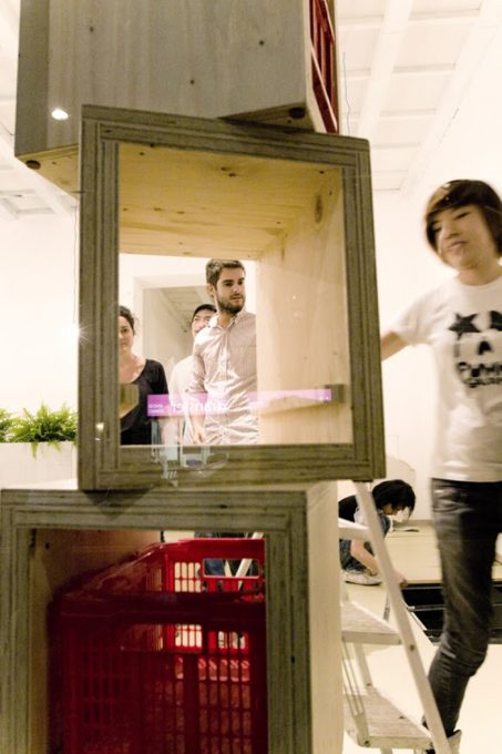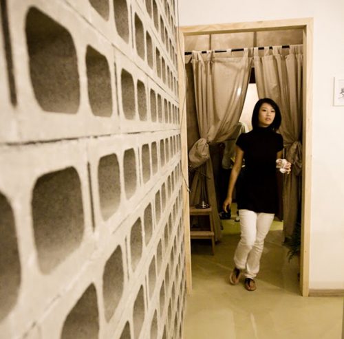 Las mesas son de madera, las sillas han sido reemplazadas con taburetes bajos, un sistema de comer típicamente asiático, sin respaldo. Estos taburetes también realizados en madera con un agujero en el centro permiten guardar las cestas de colores, concebidas como contenedores para los clientes en los que poder guardar los bolsos o prendas mientras comen.
